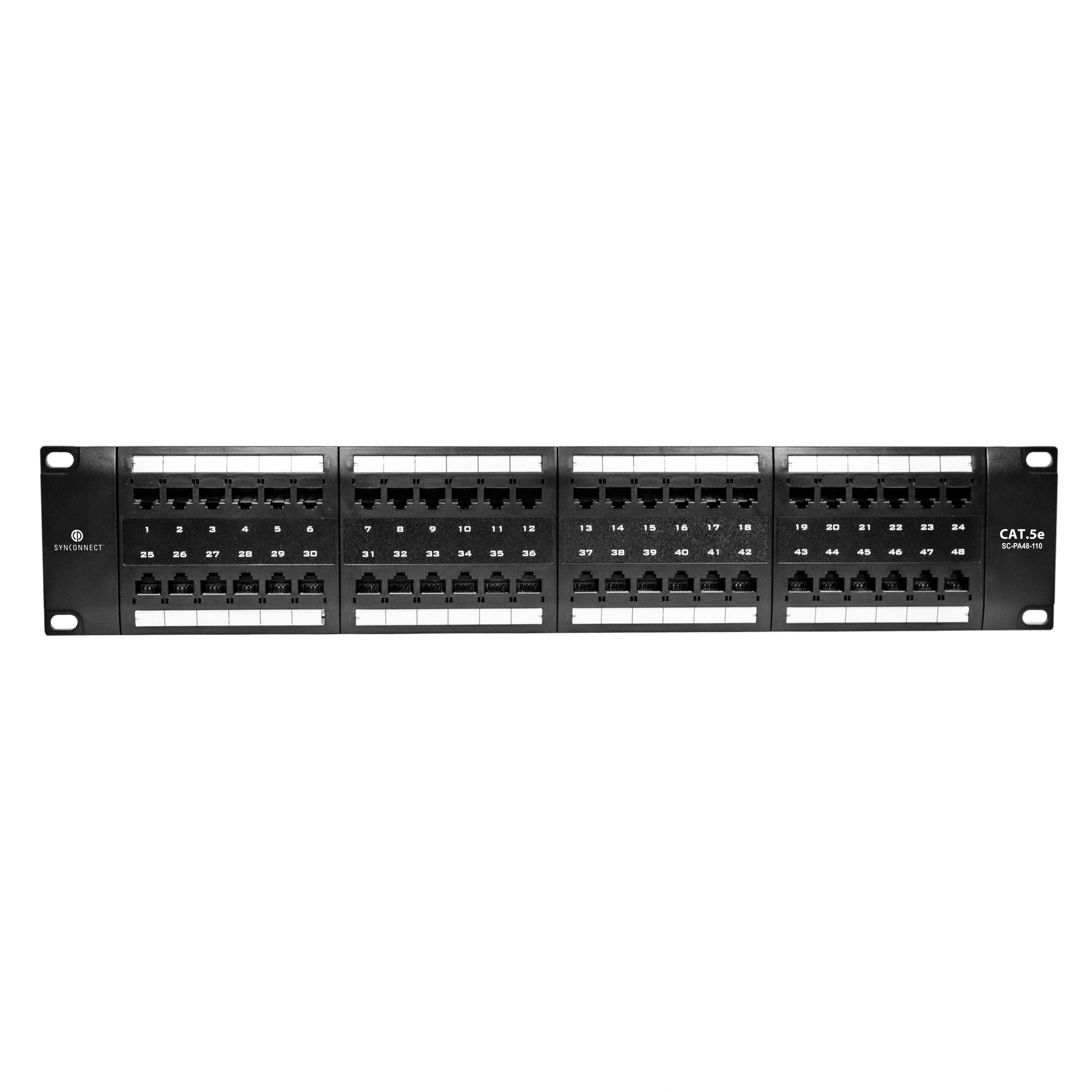 This patch panel is made for optimum performance with black electrostatic powder-coated steel and 50-micron gold-plated contacts. Every panel comes with 110-type termination while meeting and exceeding EIA/TIA TSB-40 Cat5E connecting hardware specifications. The clear numbering on both the front and back of each panel provides a quick, easy way to identify cable runs.