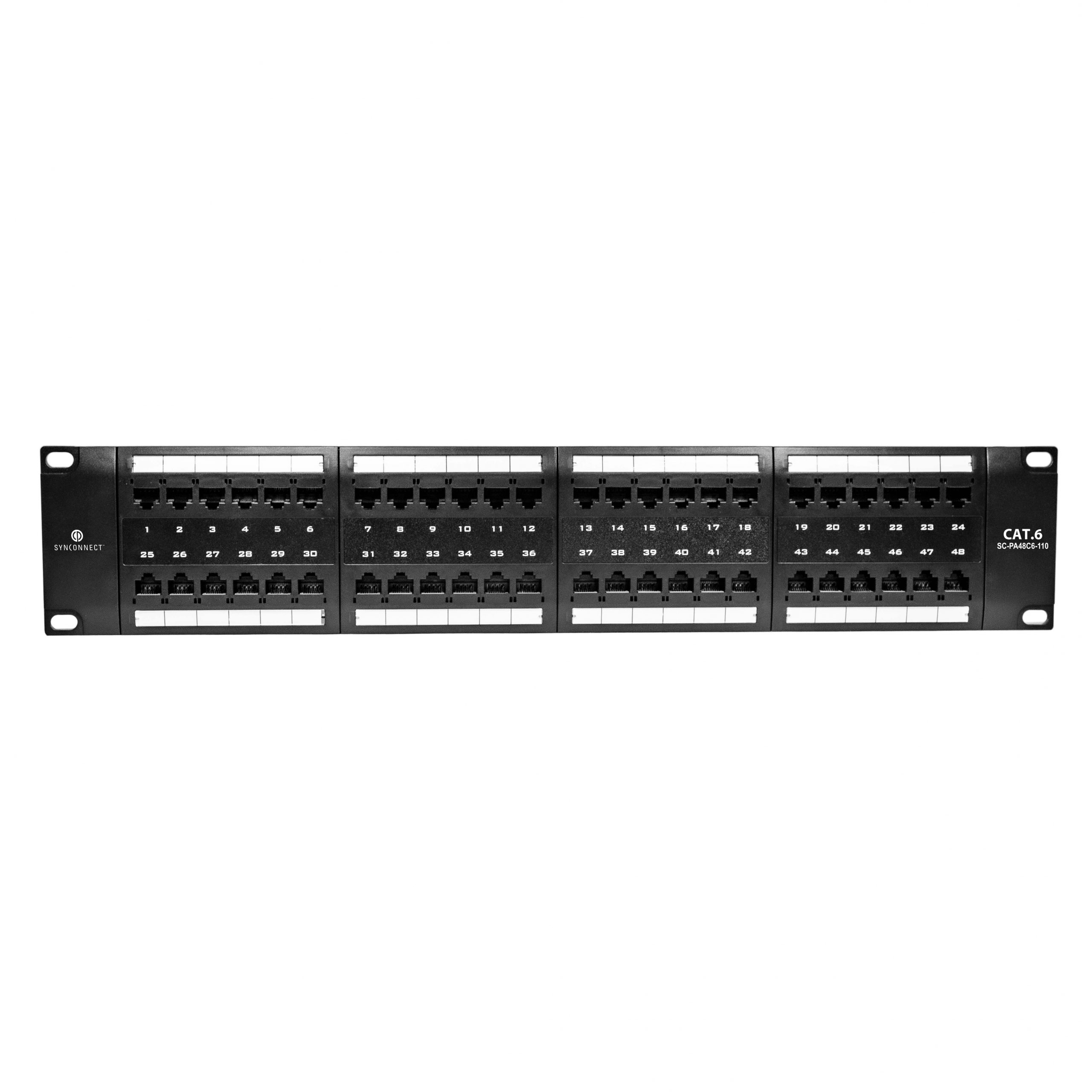 This patch panel is made for optimum performance with black electrostatic powder-coated steel and 50-micron gold-plated contacts. Every panel comes with 110-type termination while meeting and exceeding EIA/TIA TSB-40 Cat6 connecting hardware specifications. The clear numbering on both the front and back of each panel provides a quick, easy way to identify cable runs.