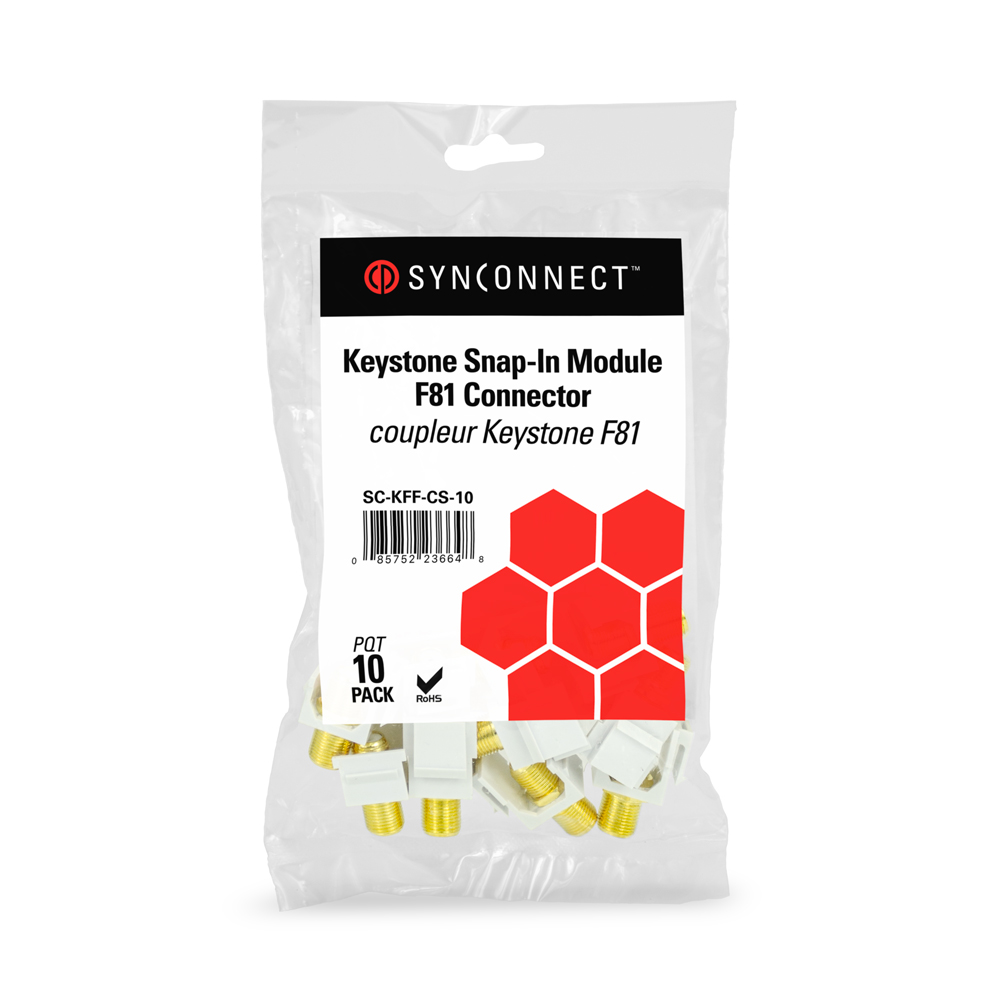 F-type Keystone Jack- Coupler type (female connectors on the front and back). These contractor series keystone inserts are an easy and affordable way to customize wall plates or patch panels to fit your installation while providing a finished look. F-type keystones are commonly used for cable, satellite, and TV antenna signals. This F-Type Keystone features a gold-plated connector. Mount this keystone adapter into any keystone wall plate or patch panel.